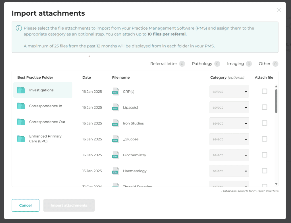 - Check the box in the Attach File column for the files you want to attach. You have the option of assigning a category (i.e. Pathology, Imaging) to each attachment you want to import. Note a maximum of 10 files can be attached per referral.