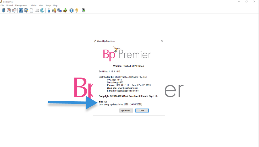 Access your Bp Premier system and navigate to Help > About from the main screen. Locate the Bp Site ID displayed in the bottom left corner.