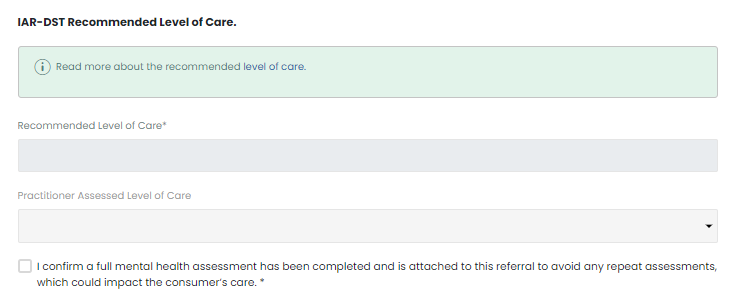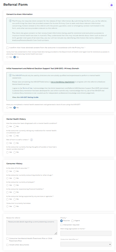 - Initial Assessment and Referral Decision Support Tool (IAR-DST)-aligned capture: Customised Consultmed eReferral forms embed IAR-DST domains and logic to standardise severity assessment and the recommended level of care.