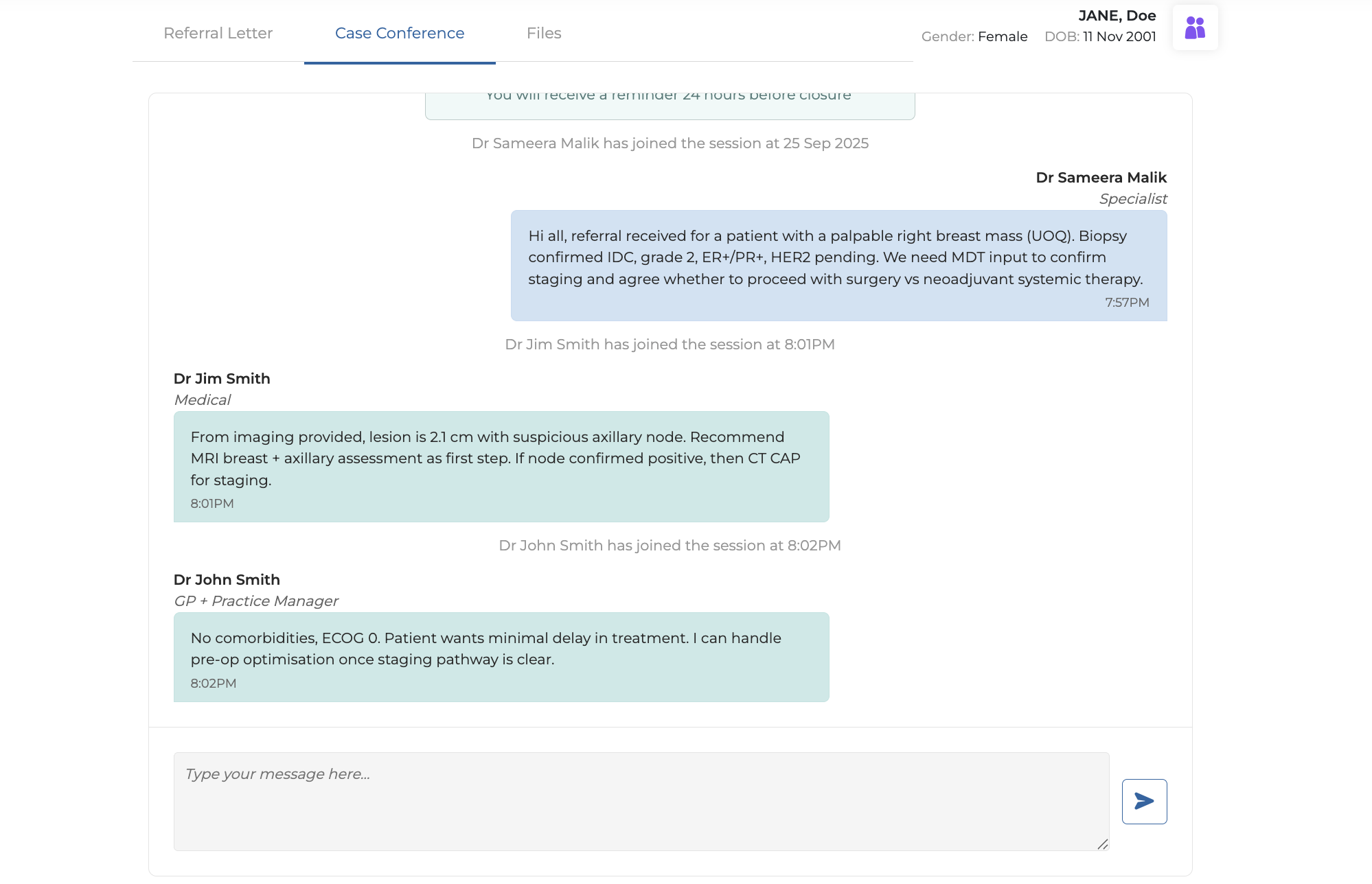 • Active and inclusive participation: Specialists, allied health providers, nurses, and referrers can all join, with full names and roles displayed.